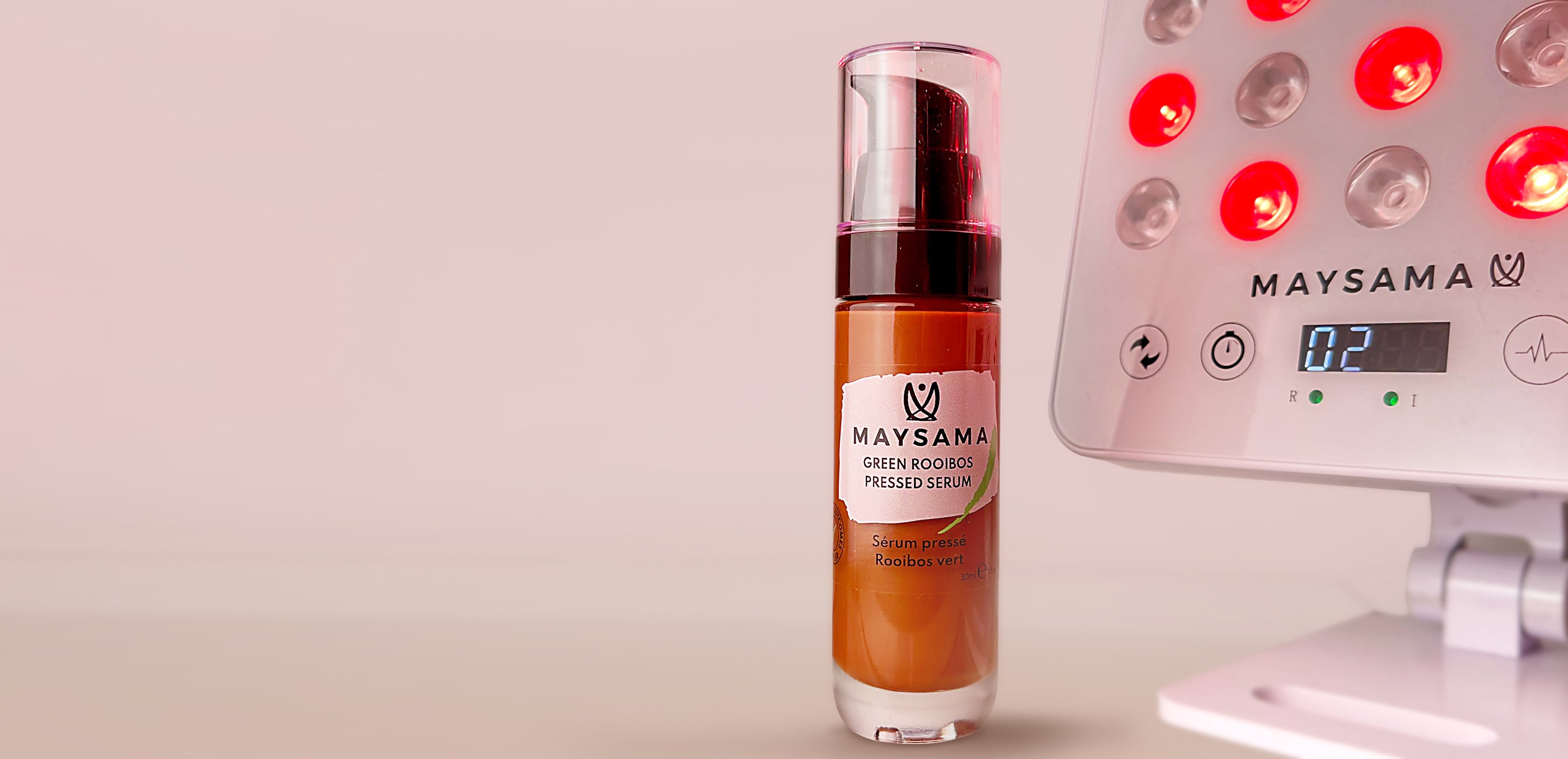Maysama combines AEG-rooibos with LED Light Therapy to accelerate and amplify results for skin rejuvenation. Our unique bioactive ingredient, Aspalathin-enriched Green Rooibos Extract, is proven to complement the action of your red light device and increase the efficacy to help tackle signs of aging.