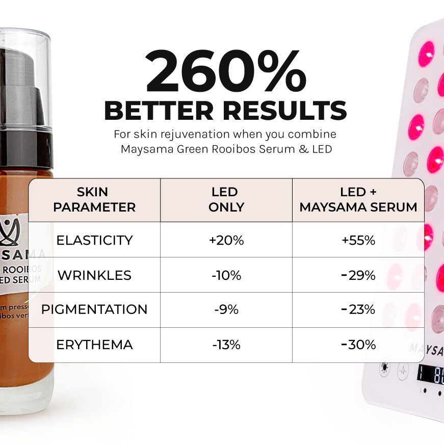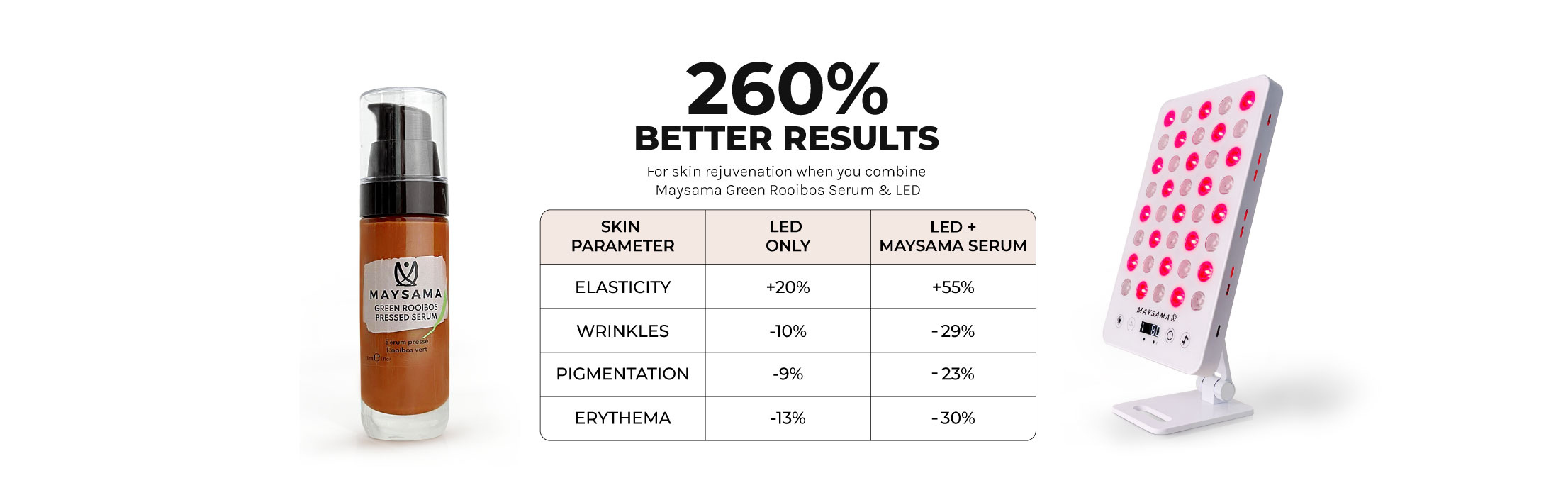 Results: Skin rejuvenation parameters increased on average by 260% when using Maysama Green Rooibos Pressed Serum with LED, relative to using LED alone.