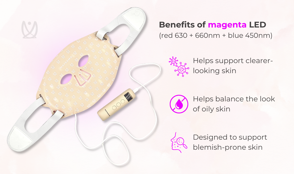 Magenta (Red + Blue): Studies support that magenta LED light has antibacterial properties and helps regulate excess oil production, therefore this mode may help support clearer-looking, acne-prone skin.