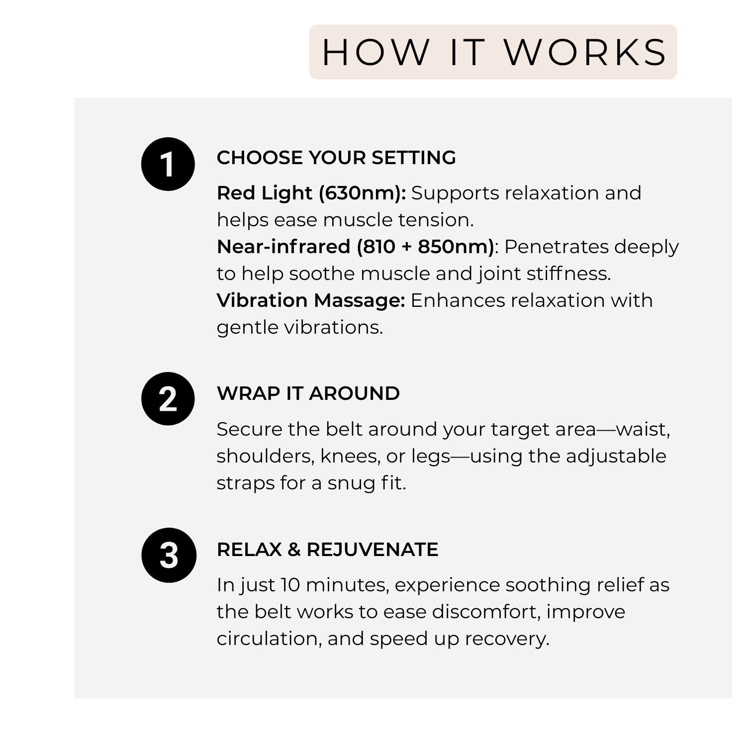 Using clinically supported wavelengths of red (630nm)and near-infrared (810nm and 850nm) light, the device delivers targeted soothing effects to areas such as the lower back, abdomen, shoulders, and other body zones.